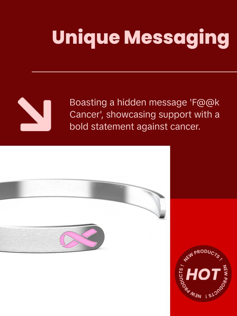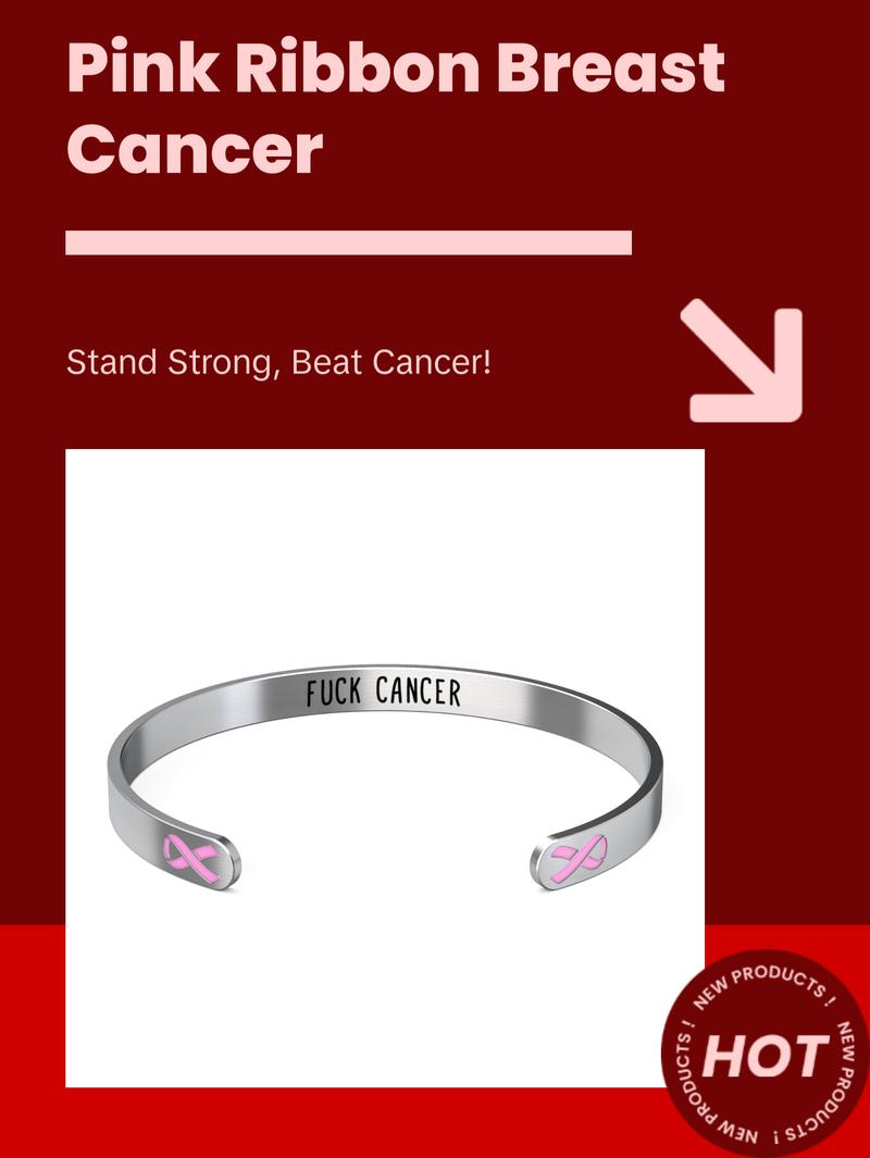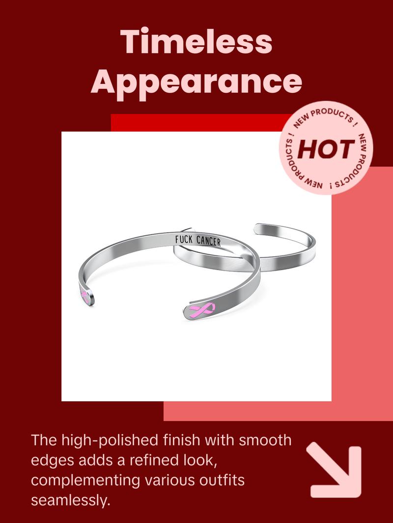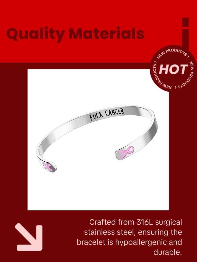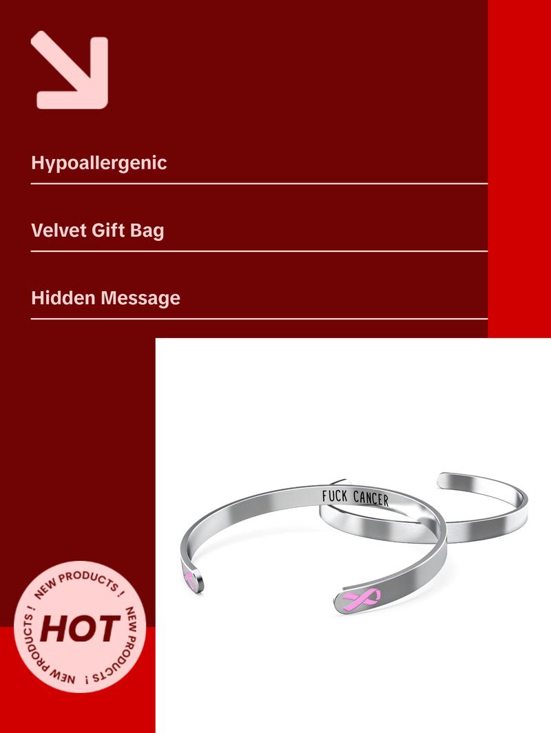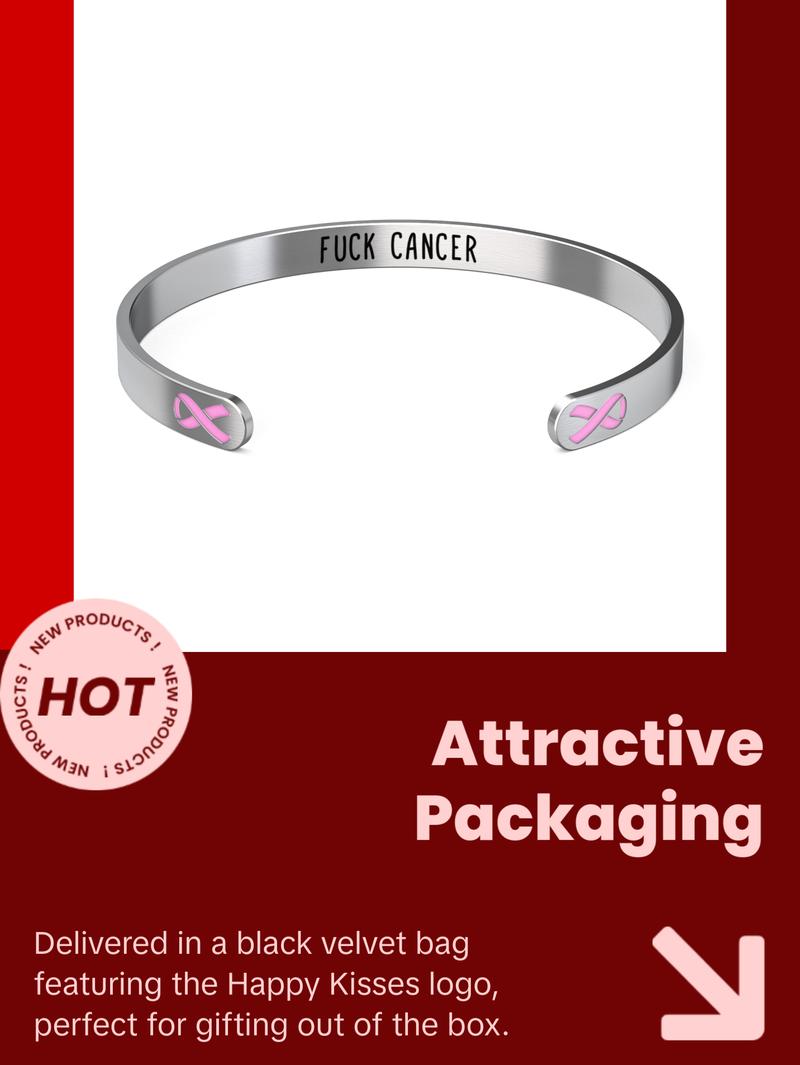 - High-quality stainless-steel cuff bracelet designed for the great women who are fighting or have fought against breast cancer and for the friends and family that have stood by their side in the fight. They come in a nice velvet gift bag, has the cancer ribbon on the outside and a hidden message “F@@k Cancer” on the inside. Beautiful classic bracelet that will match any outfit or occasion. Show your appreciation for the strength of people and their family & friends that have fought cancer.