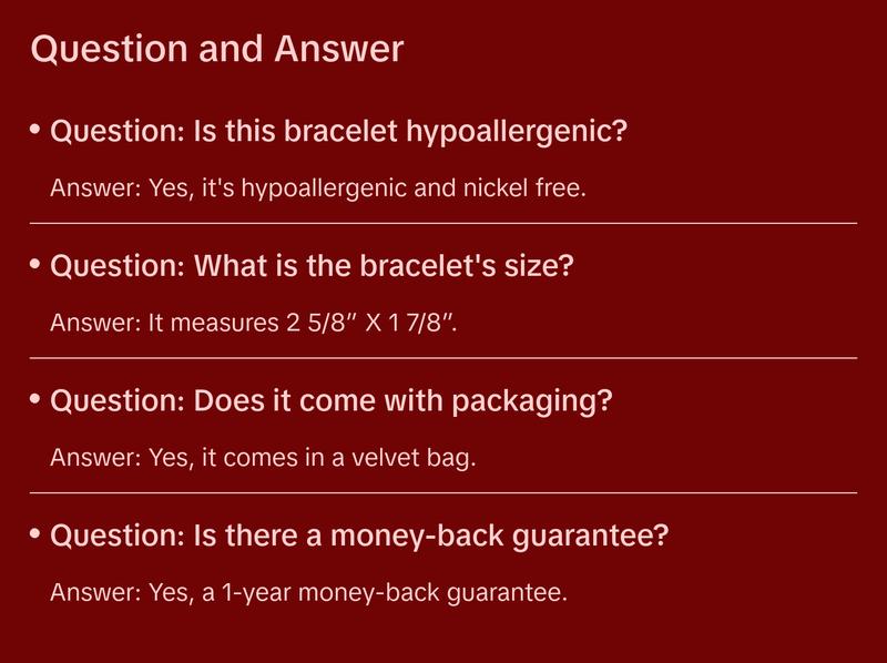 - Quality Guaranteed: Made from strong surgical 316L stainless steel, this bracelet is hypoallergenic and nickel free. It WILL NOT fade, tarnish, rust, discolor skin, corrode, stain and is 100% healthy to wear. Highly polished and with smooth edges to prevent any scratching. We provide a 1-year money back guarantee against quality related issues.